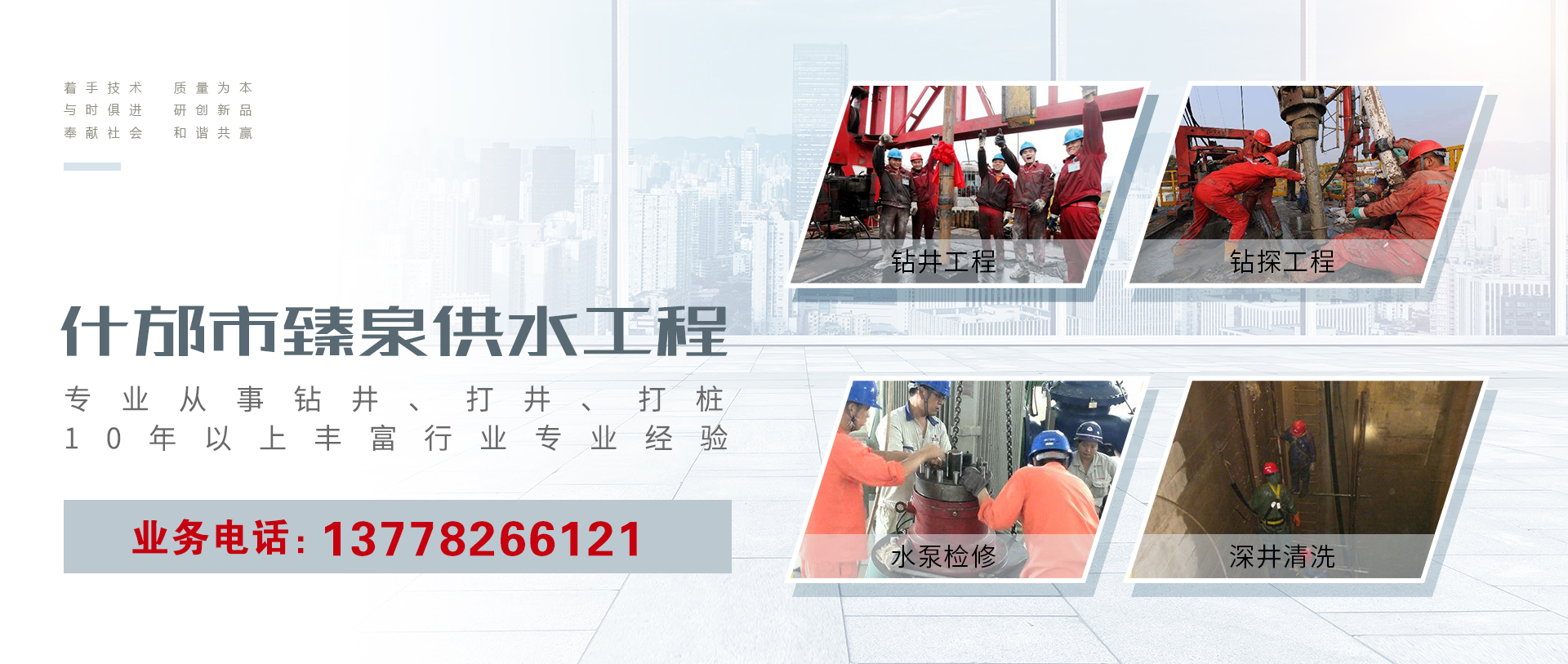 什邡市臻泉供水工程有限公司,座落于四川省德陽市什邡市南泉鎮(zhèn)南陽村15組,公司成立于2017年,目前是四川德陽地區(qū)專業(yè)從事工地降水井施工、降水井排水管道安裝布設(shè)、農(nóng)業(yè)灌溉井施工、工業(yè)深水井施工、人畜飲水工程深水井施工、野外地下水勘探、工地基礎(chǔ)護(hù)壁樁、橋梁承重樁施工的專業(yè)打井、降水、打樁、水塔安裝的施工隊(duì)伍。 公司在成立的前身是一支10多年時(shí)間常年在四川甘孜州、阿壩州、德陽市、成都市、綿陽市、南充市、遂寧市、青海省玉樹自治州、西藏自治區(qū)日喀則市、阿里地區(qū)、...